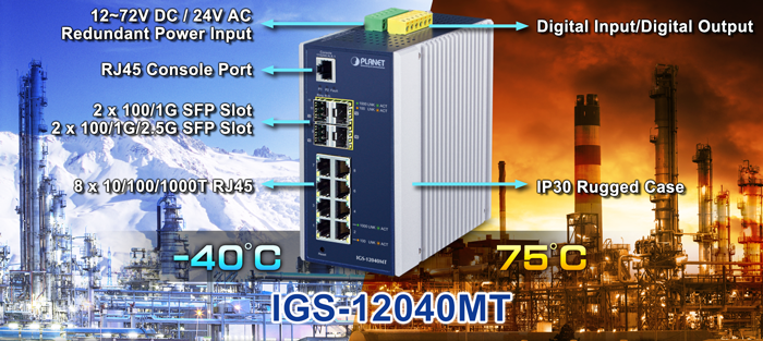 PLANET IGS-12040MT is a fully-managed Gigabit fiber switch usually designed for the industrial network. It features 8 10/100/1000BASE-T copper ports, 2 100/1000BASE-X SFP ports, 2 100/1000/2500BASE-X SFP ports and redundant power system in an IP30 rugged but compact-sized case that can be installed in any difficult environment without space limitation. It provides user-friendly yet advanced IPv6/IPv4 management interfaces, abundant L2/L4 switching functions and Layer 3 static routing capability.