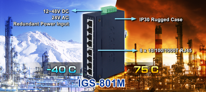 The IGS-801M offers high performance and high reliability to make sure the continuous industrial operation in harsh environments such as control cabinet of transportation, factory floors, outdoor space, and the places where the temperature is extremely low or high. With a non-blocking design and desktop size, the installation of PLANET IGS-801M 8-port Gigabit Managed Industrial Ethernet Switch is as easy as that of a Fast Ethernet network and it is helpful to build a Gigabit high-bandwidth switched network quickly.