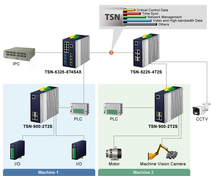 PLANET TSN-900-2T2S, based on its advanced Time-Sensitive Networking (TSN) technology and utilizing IEEE 1588 Precision Time Protocol (PTPv2) for time synchronization on all ports, provides an efficient solution. Leveraging real-time data monitoring and low-latency data transmission advantages, it can be used for real-time monitoring and management of factory production processes. This system harnesses the performance of TSN to enhance production efficiency, optimize resources, and enable quick response to faults, making it a highly promising solution.
