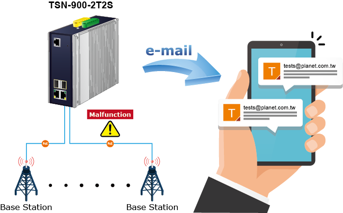 The TSN-900-2T2S provides event alert function to help to diagnose the abnormal device owing to whether or not there is a break of the network connection, or the rebooting response.