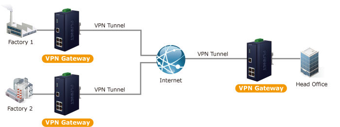 PLANET IVR-100 can work as a VPN security gateway in an industrial application for a company that has a factory and many different divisions. With IPSec/GRE/PPTP/L2TP/SSL VPN solutions, the IVR-100 provides secured data communication for branches, vendors, and mobile workers with a flexible way to connect back to the headquarters.