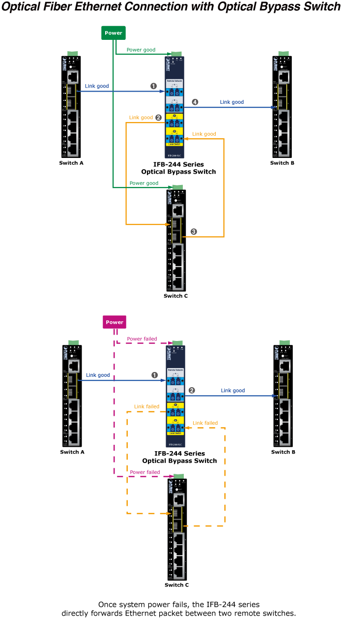 The IFB-244 Series applies fiber-to-fiber technology to achieve ultra-low losses and ultra-fast switching time. Two of the fiber ports are used to connect to two remote fiber switches and the other two fiber ports are used to connect to the local fiber switch. The IFB-244 Series and the local fiber Ethernet switch are powered from the same power source.