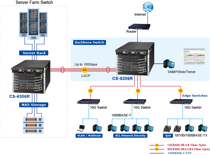The CS-6306R can provide a maximum of up to either 192 high-density Gigabit Ethernet ports, 192 SFP ports, 64 10G SFP+ ports or 16 40G QSFP+ ports which are available for remote uplink connectivity in a single system and provide the uplink to the edge network through 1Gbps to 40Gbps optical transceiver modules. The CS-6306R offers a comprehensive set of modules for complex network and gives network manager the flexibility to expand large area network when needed.