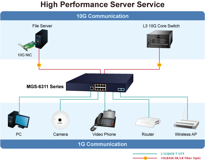 The MGS-6311-8P2X performs 80 Gigabits per second non-blocking switch fabric, so it can easily provide a local 10Gbps high bandwidth Ethernet network for the backbone of your department. With the two built-in SFP+ ports, the MGS-6311-8P2X provides the uplink to the backbone network through the 10G Ethernet LR/SR SFP+ modules. It further improves the network efficiency and protects the network clients by offering the security and QoS features.