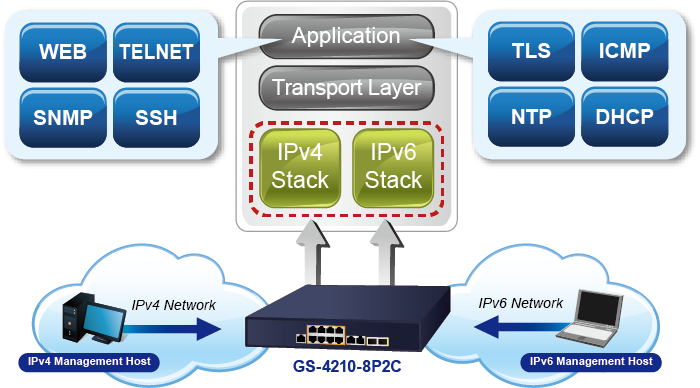 Supporting both IPv6 and IPv4 protocols, the GS-4210-8P2C helps the SMBs to step in the IPv6 era with the lowest investment as its network facilities need not be replaced or overhauled if the IPv6 FTTx edge network is set up.