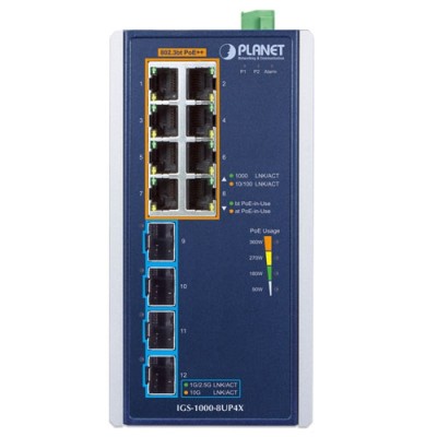 Featuring Plug and Play designed and 10G SFP+ uplink ports to be installed in heavy industrial environments, PLANET IGS-1000-8UP4X Industrial-grade, DIN-rail type Unmanaged Gigabit Ethernet Switch features eight 10/100/1000BASE-T ports and IEEE 802.3bt PoE++ (Power over Ethernet Plus Plus) injector function to deliver up to 95 watts of power output and high data transmission speed to PDs (powered devices) installed in a remote area where sufficient and reliable power input is required. Its four 1G/2.5G/10GBASE-X SFP+ fiber optic uplink ports provide long distance, high speed and stable data transmission to a remote core network.