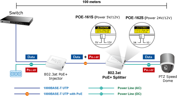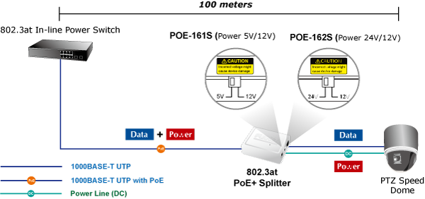 The POE-161S can work with the IEEE 802.3at PoE Plus injector devices like the POE-161/POE-163/POE-164, IEEE 802.3at PoE Plus Switch and Media Converter to transfer data and power simultaneously to the end device. The IEEE 802.3at PoE Plus complied PoE Switch and Media Converter can combine the Ethernet digital data with power over the twisted pair cables as an IEEE 802.3at PoE Plus injector. Then, the POE-161S separates the digital data and the power into 5V/12V DC power outputs. The maximum distance between the IEEE 802.3at PoE Plus injector devices and the splitter (POE-161S) is 100 meters, and the POE-161S also supports passive 10/100/1000Mbps Ethernet connection ability.