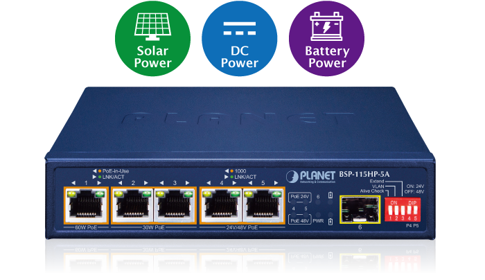 PLANET BSP-115HP-5A Solar PoE Switch is a solar-powered network switch that incorporates environmental, social and governance (ESG) principles. It can be charged by the inexhaustible and natural source of energy, such as solar, wind and hydroelectric power to conserve energy so as to economically power these remote IP cameras and wireless APs. The BSP-115HP-5A is equipped with 5 10/100/1000BASE-T copper ports. Port 1 supports 60-watt PoE and ports 2 to 5 support 802.3at PoE+ injector function. Besides, ports 4 to 5 also provide passive 24V/48V options. Using 24V PoE equipment will improve energy efficiency. When powered by a 24V battery, there is no need to go through the loss of lifting. A total PoE power budget of up to 65 watts and 1 extra 100/1000BASE-X SFP fiber port are especially used for such expansive applications as dams, forests, deserts, national parks, nature/animal protection areas and highways.